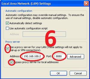 6.         Apare o fereastra cu setările curente ale server-ului Proxy, pe care le vom modifica prin scoaterea bifei  de pe   optiunea „Use a proxy server for your LAN (These settings will not apply to dial-up or VPN connections).” In caz ca  prima optiune „Automatically detect settings” nu este bifata, o activam punând bifa pe aceasta optiune. Dupa aceste actiuni apăsam butonul „OK” pentru a actualiza setările noi.