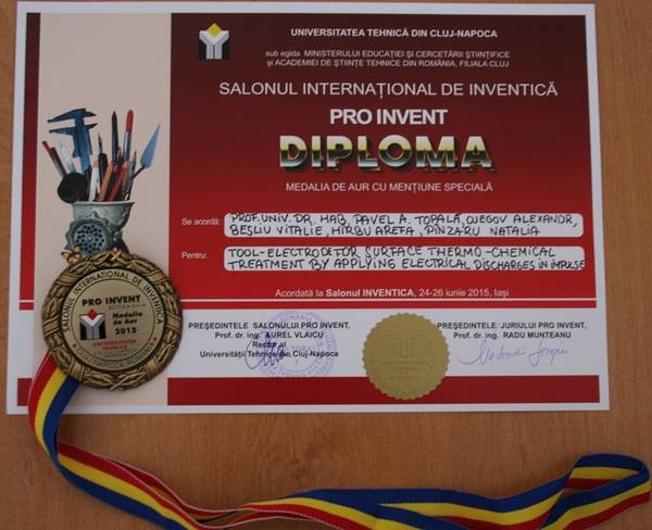 Topala Pavel, Ojegov Alexandr, Beșliu Vitalie, Hîrbu Arefa și Natalia Pînzaru s-au învrednicit de Diploma și medalia de aur cu mențiune specială, pentru invenția ”TOOL-ELECTRODE FOR SURFACE THERMO-CHEMICAL TRATEMENT BY APPLYING ELECTRICAL DISCIARGES IN IMPULSE”